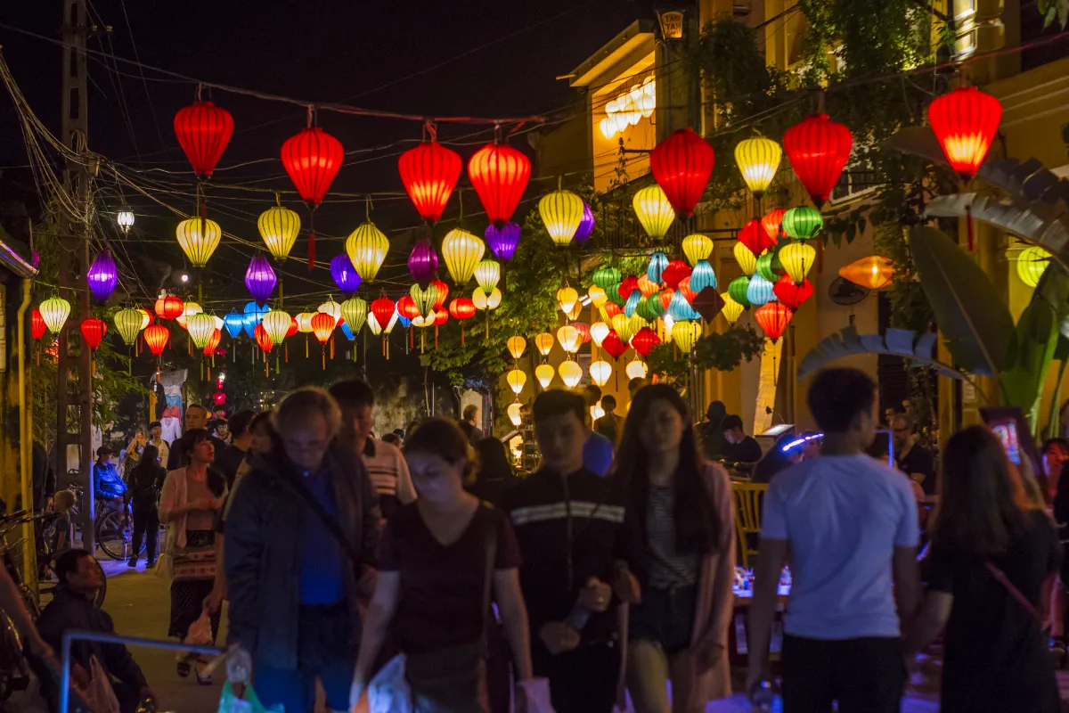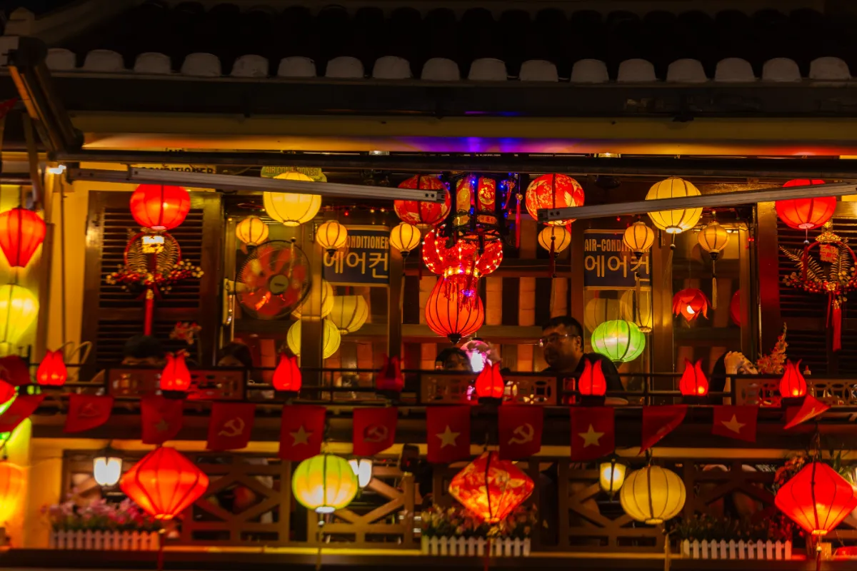 You won’t see flashy neon signs here. Instead, you get silk lanterns in red, yellow, and blue, lighting up streets and rivers with a warm glow and honestly, your phone camera will struggle to capture what your eyes see.