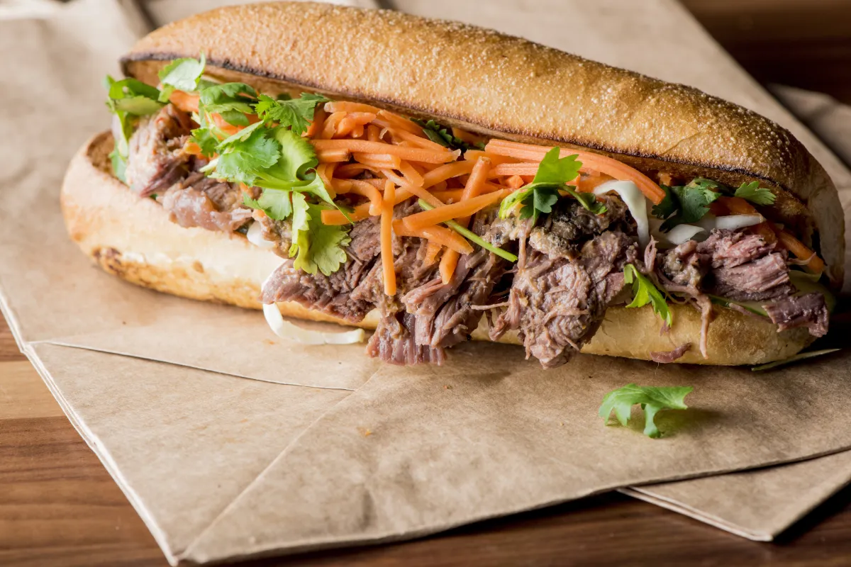 Bánh Mì is a crispy French baguette filled with Vietnamese ingredients. Inside the bread, you will usually find liver pate, various meats, pickled carrots, cucumber, and fresh cilantro. It is the perfect mix of crunchy bread and soft, savory fillings.