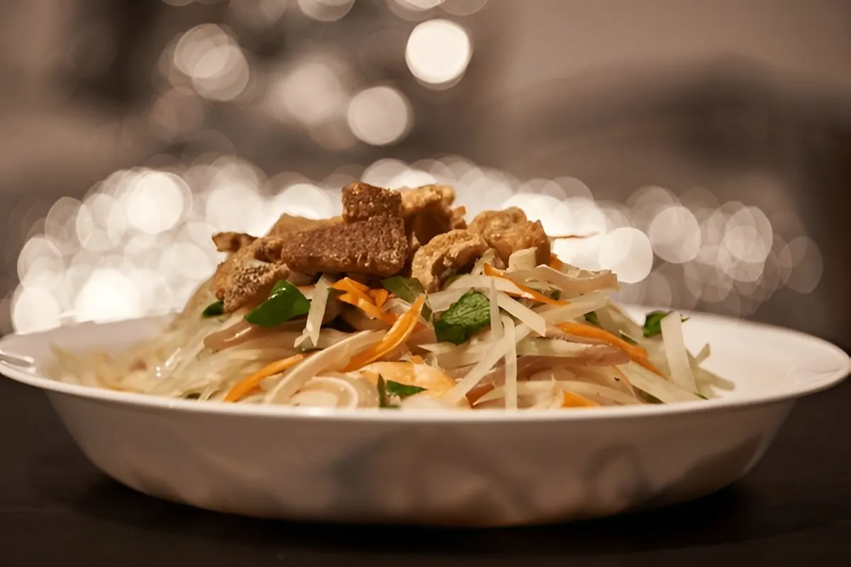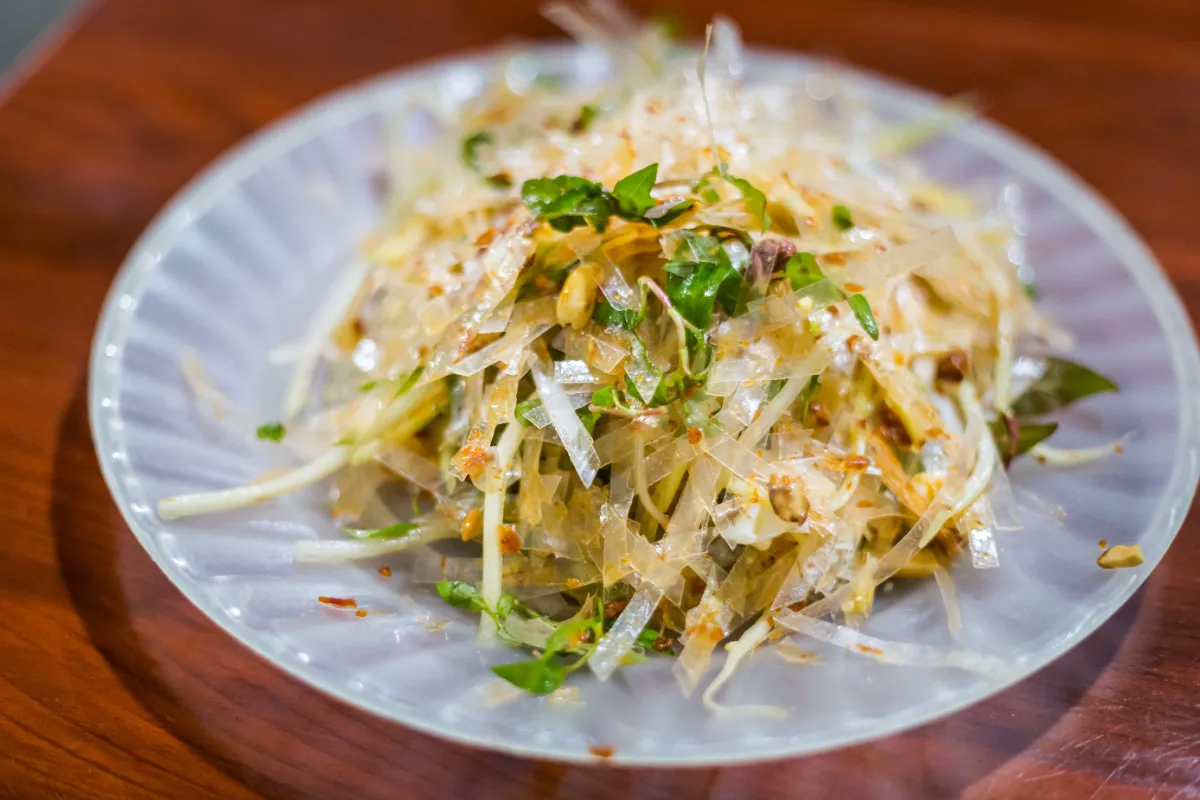 This salad is made from thin strips of raw, green papaya. It is mixed with beef jerky, peanuts, and a very spicy dressing. The papaya stays crunchy, which makes it feel very fresh and light.