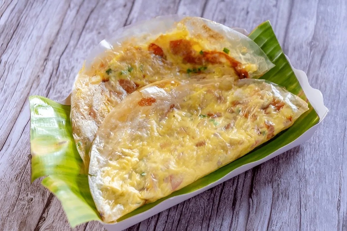 This "pizza" is actually a sheet of rice paper grilled over a charcoal fire. The cook adds butter, spring onions, minced pork, and quail eggs on top. Once it is crispy, they fold it in half or serve it flat like a cracker.