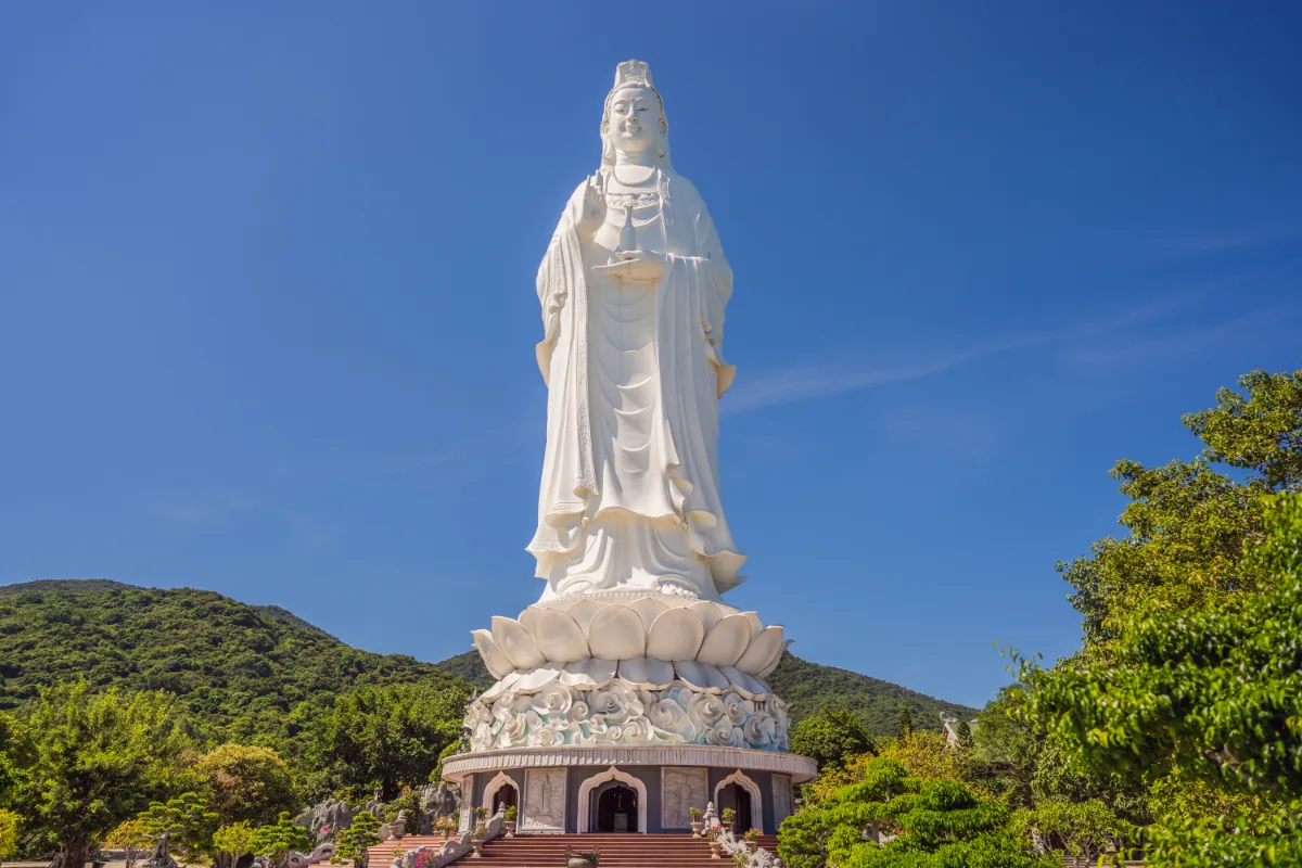 Linh Ung Pagoda is high up on the Son Tra Peninsula, with jungle on one side and the sea on the other. The 67-meter-tall Lady Buddha is visible from almost all of Da Nang. Standing at her feet, the feeling is totally different from seeing her in the distance.